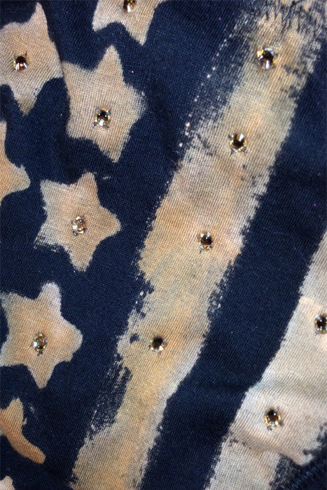 Show your 'Merican' pride in this rustic stars and stripes Teekini. Hand-painted, hand-studded with tan colored Swarovski crystals give this vintage looking suit just the right shine that will make you proud to be an American! Brown/black leopard tie sides with Betty's classic triangle top, Brazilian back and low rise front. Stiched in tan and lined in red, stamped with its very own limited edition number inside.