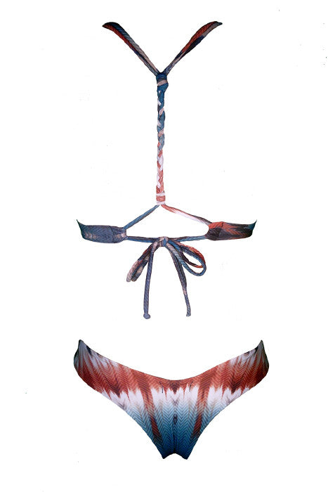 Inspired by the southwest outlaw spirit. Sienna and Teal print braided-back halter top with cheeky bottom. Available with or without scrunch (pictured without).
