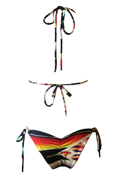 Inspired by the sweltering heat of the Mojave Desert. Black fabric with hints of Serape print. 2-way top can be worn with string across the chest, creating sexy cleav or as a triangle top with double strings. Scrunch-back cheeky bottom with double string tie-sides. Color's may vary. Available with or without scrunch (pictured with).