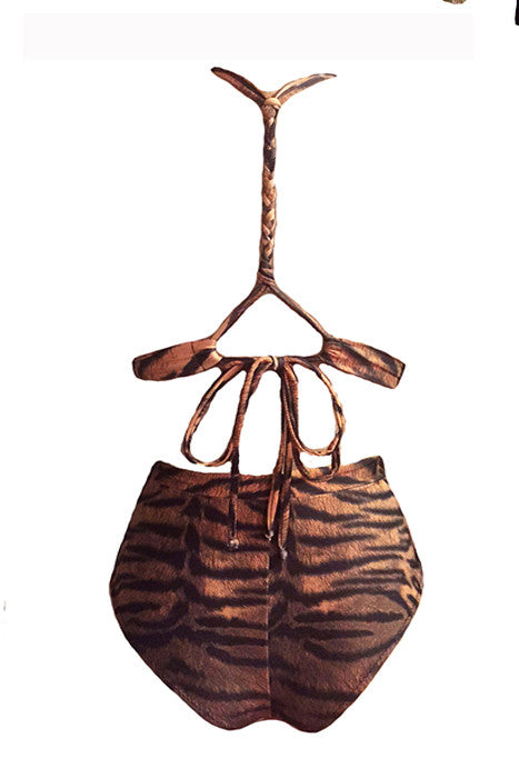 Tiger print halter top with braided back detail and highwaisted cheeky bottoms. Lined in Sable colored lycra, stitched in brown.