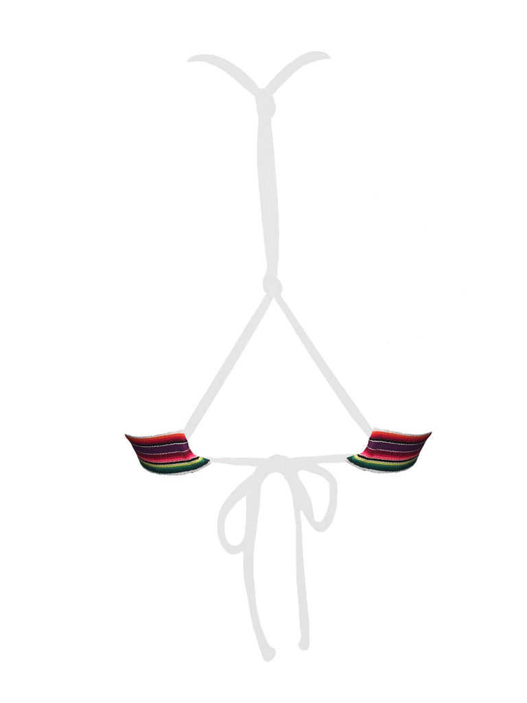 White halter top knotted back with rainbow strap and white rainbow beaded looped tie-side scrunch butt.
