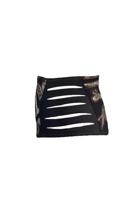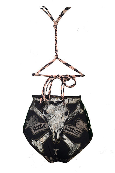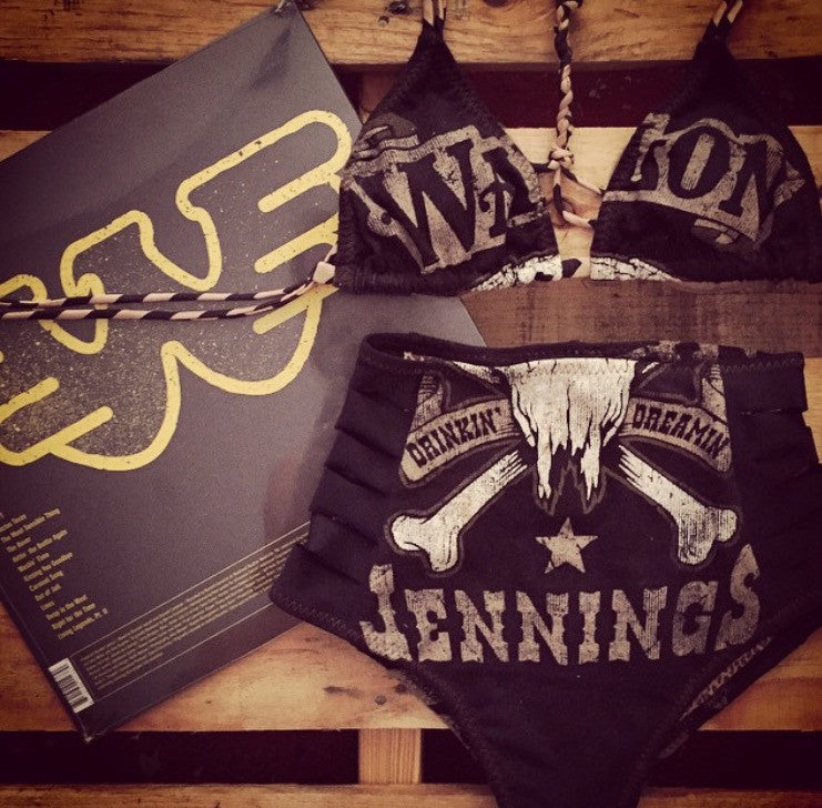 Another one inspired by Betty's favorite, Mr. Waylon Jennings.  High-waisted Drinkin' and Dreamin' Teekini with black sliced sides panels. Lined in the front with Powernet, used to hold tummy in for a sleek, flattening look. Triangle-top with 1/2" covered elastic under the cups and top strings that braid in the back. Stitched in tan and lined in little leopard print. Stamped with its very own limited edition number. (Can also be made into regular Teekini)