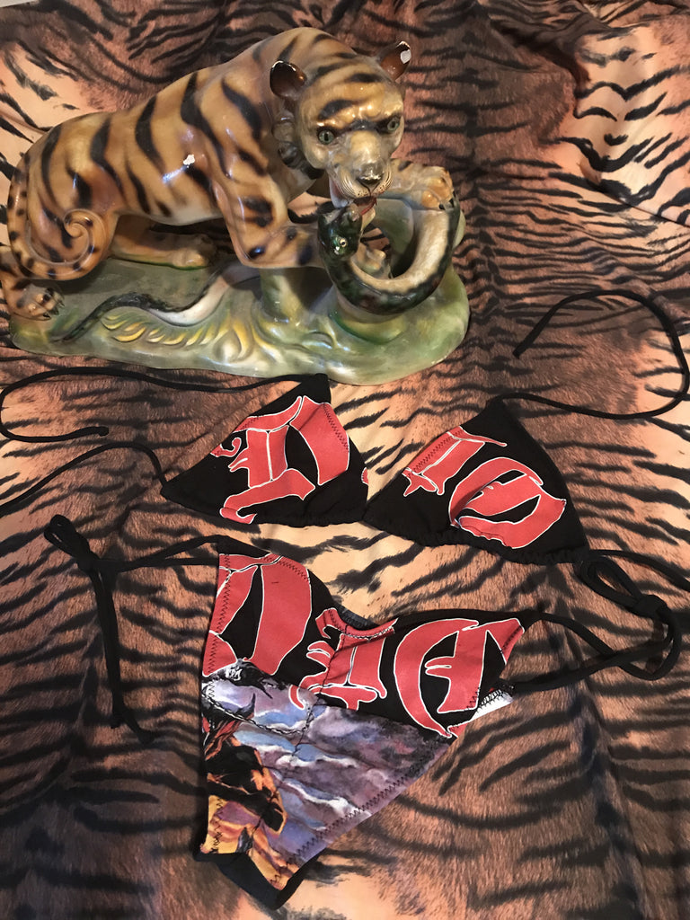 "Jump, Jump, Jump on the Tiger"...... DIO inspired Teekini. Scrunch-butt black tie-side bottom with Betty's classic triangle top (as shown). Also available in Brazilian or fuller back. Stitched in black, lined in red, and stamped with it’s very own limited edition number.