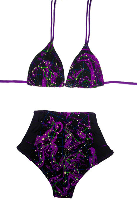 As Ms. Cleo, the 90's pay-per-minute pyschic and alleged shaman, said best... "Call Me Now" for this high-waisted Zodiac/Constallation, glow-in-the-dark print Teekini with black sliced sides and purple peek through panels. Lined in the front with Powernet, used to hold tummy in for a sleek, flattening look. Classic triangle-top, stiched in purple and lined in lavender. Stamped with its very own limited edition number. This suit can be made into a regular bikini style. Please advise when contacted regarded sizing.