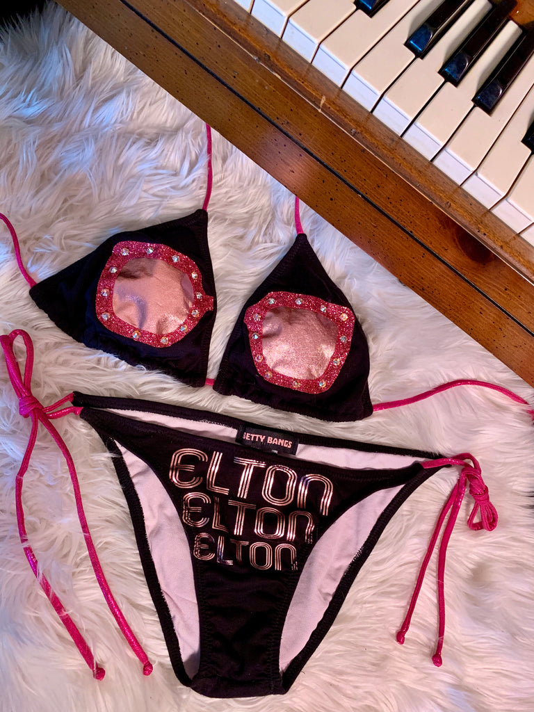 It's the way that I move, the things that I do Wooo ooooh yea!!” Elton John inspired Teekini. Hot pink metallic tie-sides with Betty's classic triangle top, low rise front with Brazilian or fuller back. Glitter and metallic printing, Stitched in black, lined in pink, and stamped with it’s very own limited edition number.