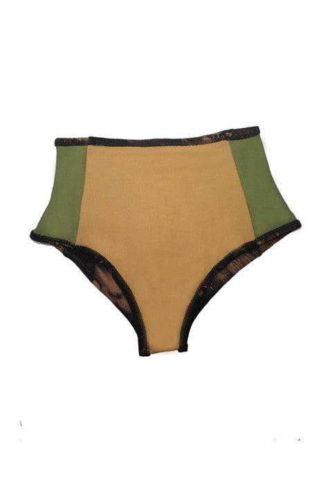 Inspired by Betty's best friend, Ms. Starfeather, and her magical, spiritual ways. High-waisted Teekini with leopard side panels. Lined in the front with Power-net, used to hold tummy in for a sleek, sexy look. Triangle top has feather shaped bone pendant and turquoise stone in the middle. Stitched in brown and lined in olive green. Stamped with its very own limited edition number. Please advise when contacted regarded sizing.