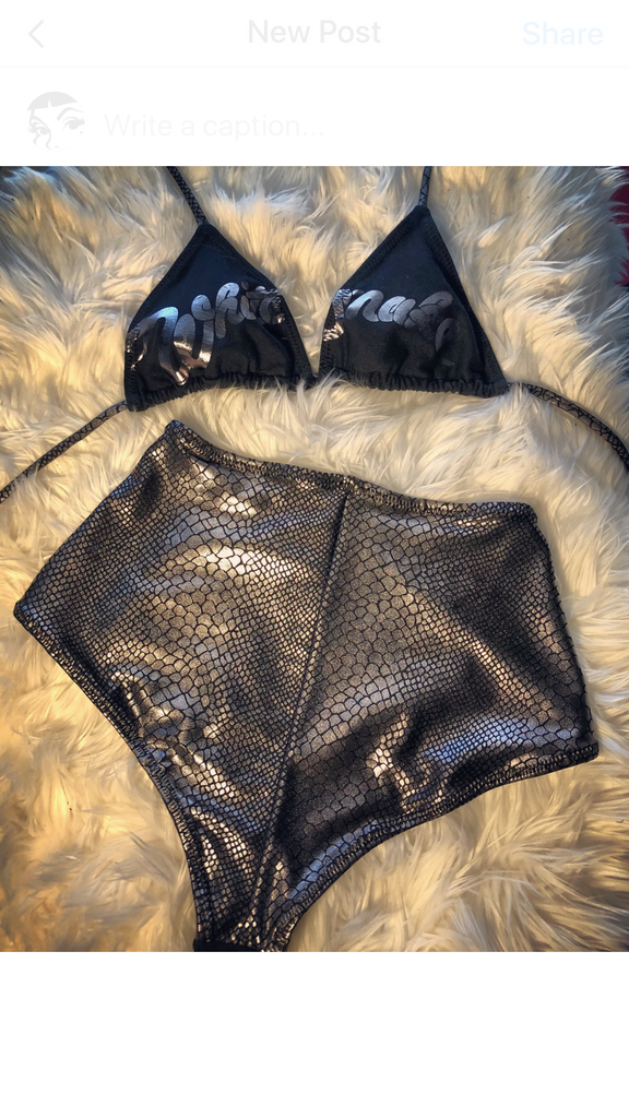 "Everywhere I look there is trouble, always coming my way, trouble always coming my way." Whitesnake inspired high-waisted Teekini with metalic snake print sides and back. Lined in the front with Powernet, used to hold tummy in for a sleek, flattening look. Classic triangle-top, stitched in black and lined in black. Stamped with its very own limited edition number.