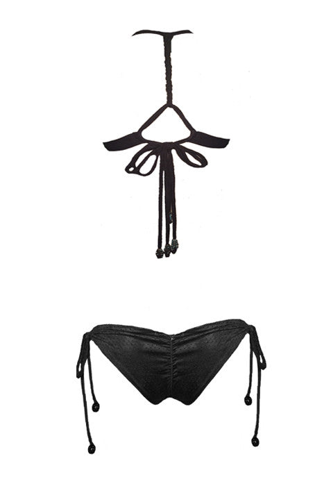 Black pseudo-suede, stretch microfiber braided back halter top with low-rise front, looped tie-sides, and scrunch-butt bottoms (damn, that's a mouth full!). Suede is butter soft, perforated, and lined in a soft baby mesh.
